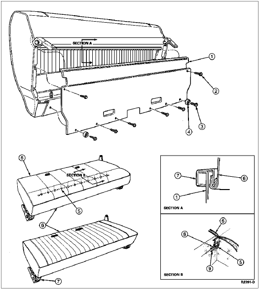 Remove rear fold-down seat from vehicle. Refer to Seat, Rear, Folding, Bronco in the Removal and Installation portion of this section.