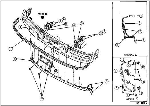 If replacing bumper bar, remove front bumper horizontal pads (17C829), front fender apron and radiator support braces (16A023) or front license plate mounting bracket (17A386). Refer to Bumper Bar in the Removal and Installation portion of this section.