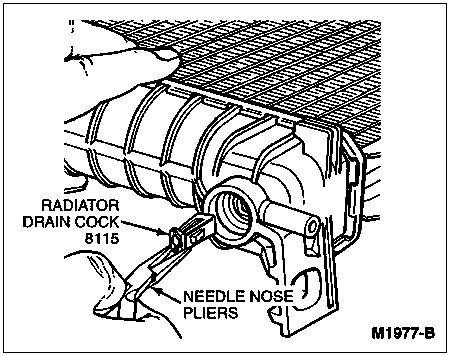 Remove the radiator draincock from the radiator by squeezing the sides together with a pair of needlenose pliers. Then pull the radiator draincock from the radiator inlet tank.