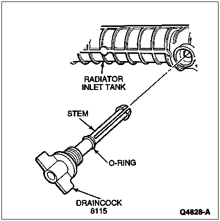 Turn the radiator draincock counterclockwise to unscrew. When the radiator draincock is unscrewed to the end of the threads, pull the stem from the radiator inlet tank.