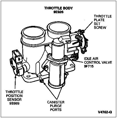 The throttle body (9E926) controls airflow to the engine (6007) through a double butterfly-type valve. The throttle position is controlled by multiple-link, progressive opening throttle linkage. The body is a single-piece die casting made of aluminum. It has a dual bore with an air bypass channel around the throttle plate. This bypass channel controls both cold and warm engine idle control as regulated by an idle air control valve (IAC valve) (9F715) mounted directly to the throttle body. The valve assembly is an electromechanical device controlled by the powertrain control module (PCM) (12A650). It incorporates a linear actuator which positions a variable area metering valve.