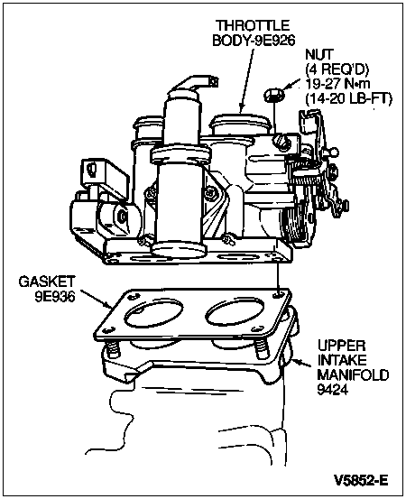 Secure throttle body to upper intake manifold with four retaining nuts. Tighten to 19-27 Nm (14-20 lb-ft).