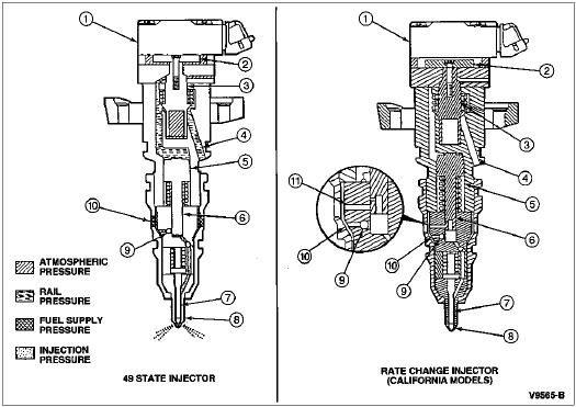 When the fuel injector is energized, a poppet valve is opened by an electronic solenoid mounted on the fuel injector. High-pressure oil from the high-pressure oil pump flows into the fuel injector and acts on the amplifier piston, forcing the piston plunger downward. As the plunger moves down, the increased fuel pressure closes the fuel inlet check ball. Rising fuel pressure overcomes spring pressure and opens the nozzle check valve. Fuel is then injected into the combustion chamber through the eight spray orifices in the nozzle tip at pressures as high as 124,110 kPa (18,000 psi). When the fuel injector is de-energized, high-pressure oil on top of the amplifier piston is vented by the poppet valve through the top portion of the fuel injector to the oil pan.
