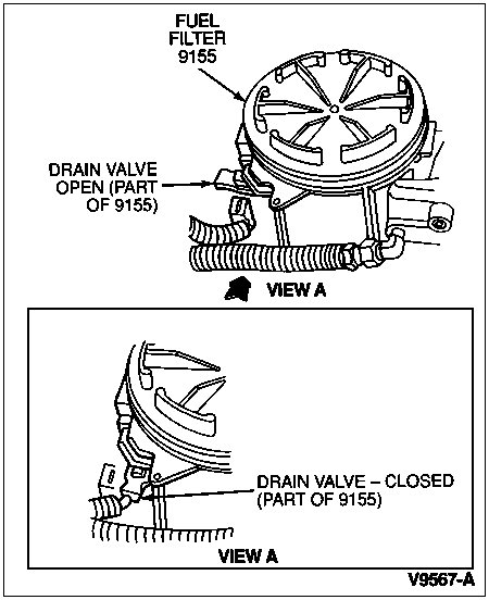 Manually open the drain valve by rotating it away from the fuel filter (9155).