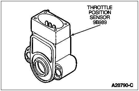 The throttle position sensor (TP sensor) (9B989) is a potentiometer that provides a signal to the powertrain control module (PCM) (12A650) proportional to the throttle plate position. The throttle position sensor connects to the throttle plate shaft.
