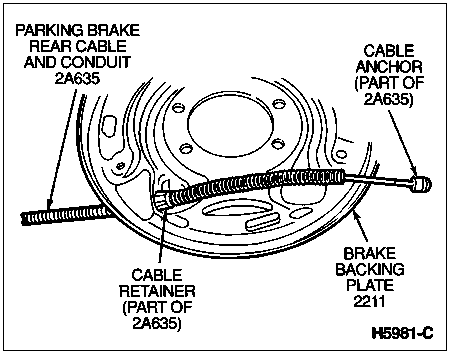 Working on the wheel side, compress the prongs on the cable retainer so they can pass through the hole in the brake backing plate (2211). Draw the rear parking brake cable retainer and the parking brake rear cable and conduit out of the hole.