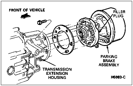 Remove the six hex-head bolts attaching the parking brake assembly to the transmission extension housing.