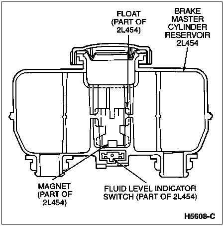 The brake master cylinder sensor is an integral part of the brake master cylinder reservoir. It is serviced as a part of the brake master cylinder reservoir. It consists of a float containing a magnet and a reed switch mounted in the bottom of the brake master cylinder reservoir. When the fluid in the brake master cylinder reservoir gets to a predetermined level, the floating magnet actuates the reed switch, causing the warning lamp to light. Loss of fluid from either the primary (front) or secondary (rear) system will cause this system to actuate.