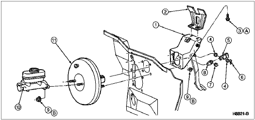 On vehicles equipped with automatic transmissions, remove one spring retainer and brake and clutch pedal bushing from the clutch and brake pedal pivot shaft. From the other end, pull out the shaft and remove the brake pedal. Remove the bushings and washer spring from the brake pedal.