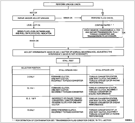 CAUTION: Perform line pressure test prior to performing stall test. If line pressure is low at stall, do not perform stall test or further transmission damage will occur.