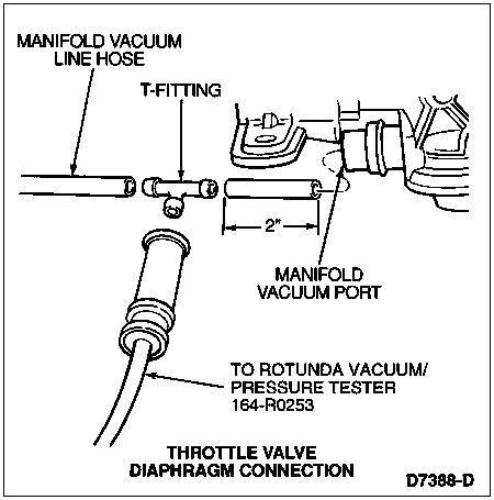 Disconnect and plug the vacuum line to the throttle valve control diaphragm. Connect Vacuum Pump D83L-7059-A or equivalent to the throttle valve control diaphragm.