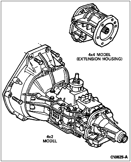 The extension housing contains a bronze alloy bushing. This bushing cannot be serviced. The extension housing must be replaced as a unit if the bushing requires service (4x2 vehicles only).
