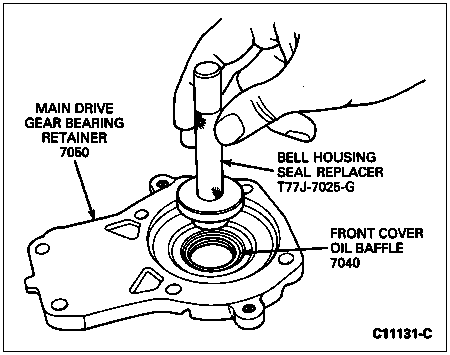Position transmission vertically (input shaft (7017) and flywheel housing facing upward). Make sure that case bushing is squarely positioned in bore. If removed, install oil baffle using Bell Housing Seal Replacer T77J-7025-G.