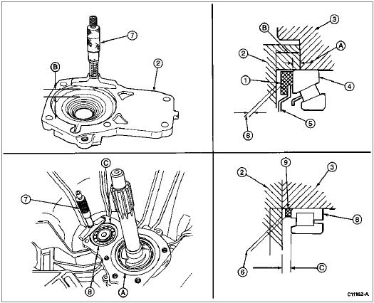 NOTE: If any related parts (such as output shaft, bearing, etc.) have been replaced, measure dimensions A, B and C as illustrated. After measuring all dimensions, select bearing shim to maintain end play within specified limits.