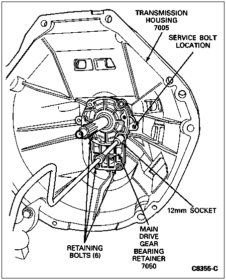 Using a 12mm socket, remove six attaching bolts from main drive gear bearing retainer (7050).