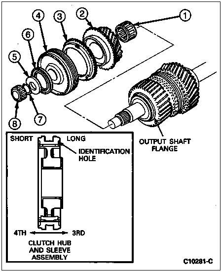 Remove input shaft bushing, bearing outer snap ring, thrust bearing and third and fourth synchronizer spacer from front (short side of flange) of output shaft.