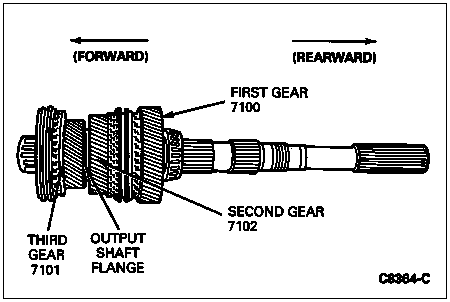 Position output shaft so that the rear end (long side of flange) faces upward. Install the following parts in the order listed: