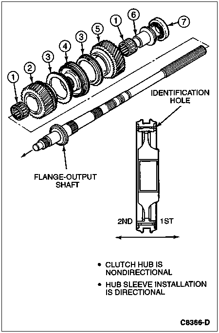 NOTE: When installing first/second synchronizer, make sure narrow width of sleeve faces second gear (front) side. Make sure reference marks face rear of transmission (7003); they reference installation position of synchronizer hub insert (7A044).