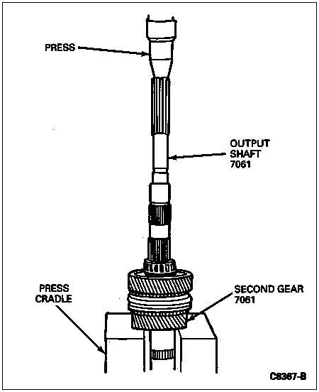 Position output shaft with rear end (long side of flange) facing upward. Position output shaft into press using Pinion Bearing Cone Replacer T53T-4621-B as a press plate contacting the lower part of second gear and Bearing Cone Replacer T88T-7025-B to protect the inner race rollers.