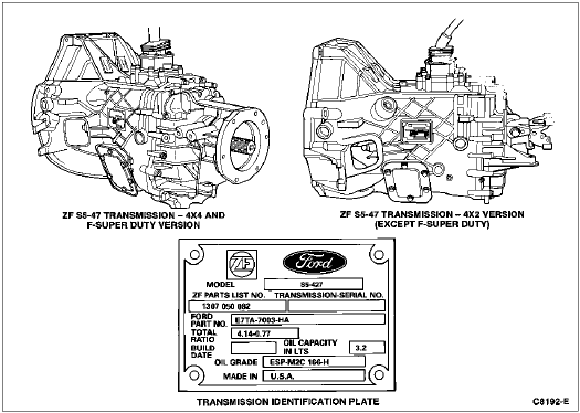 The S5-47 ZF transmission is available in both wide ratio and close ratio versions. The wide ratio version is available for all F-Series vehicles over 8500 lbs. GVW, all engines (6007), except F-Super Duty equipped with a diesel engine. The close ratio version is available only in F-Series vehicles with a 7.3L diesel engine and a GVW over 8500 lbs. The ratios are as follows: