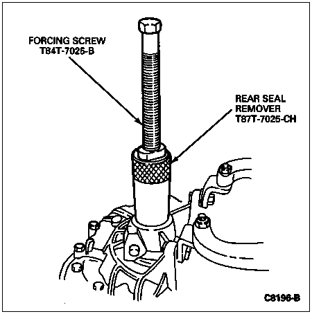 Assemble TOD Forcing Screw T84T-7025-B into seal remover. Turn forcing screw while holding seal remover to pull oil seal.
