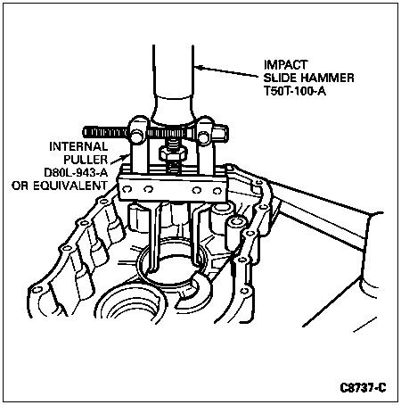 Using Impact Slide Hammer T50T-100-A, and Internal Puller D80L-943-A or equivalent, remove the outer race of output shaft rear bearing (7R205) from the extension housing.