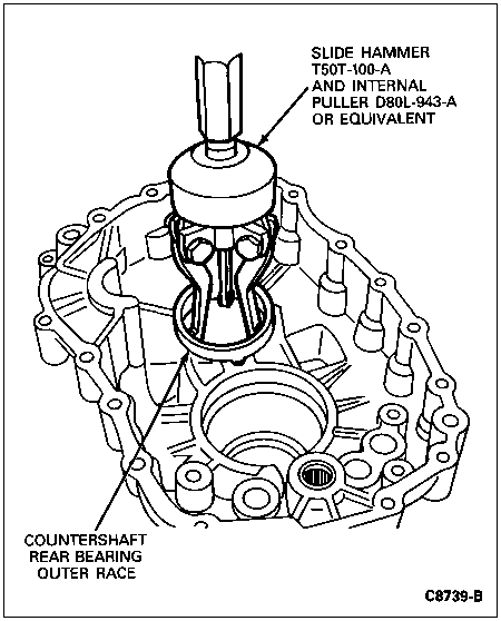 Using Impact Slide Hammer T50T-100-A and Internal Puller D80L-943-A or equivalent, remove the countershaft rear bearing outer race from the extension housing.