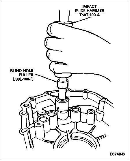 If required, remove the central shift rail bearing from the extension housing. Use Blind Hole Puller D80L-100-Q or equivalent and Impact Slide Hammer T50T-100-A to remove the bearing.