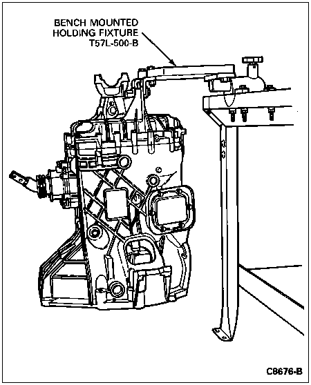 Attach the transmission (7003) to the Bench Mounted Holding Fixture T57L-500-B. Place the transmission in a vertical position with the case (7005) pointing downward.