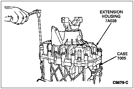 Remove 15 of the 17 8mm hex-head screws that hold the case and extension housing (7A039) together. Leave two screws at opposite sides of the extension housing installed.