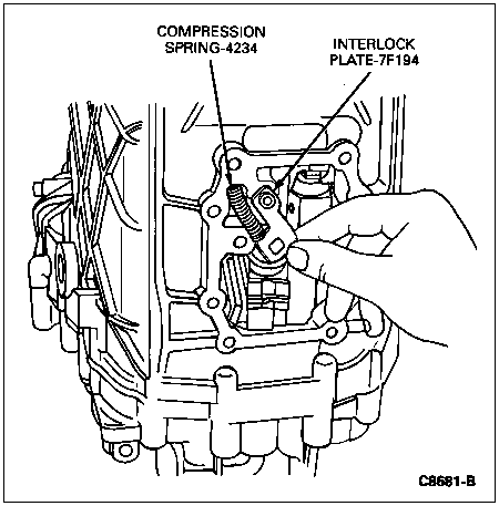 Remove the gear selector interlock sleeve (7K201) and shifter interlock spring (7234) which serves as a reverse gear interlock.