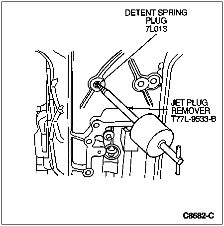Puncture the center of the detent plug and screw in Jet Plug Remover T77L-9533-B and use its slide hammer to remove plug. Repeat this procedure for the other two detent spring plugs in the case.