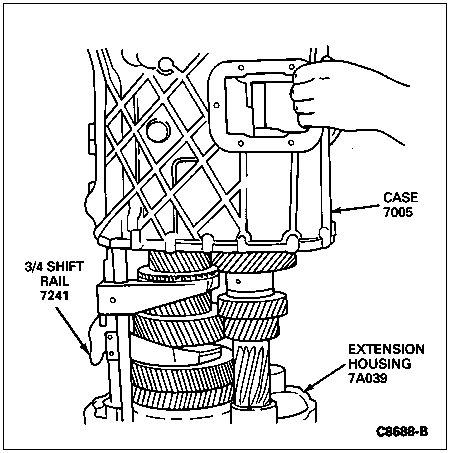 Carefully lift the case off the extension housing. It may be necessary to push the main gear shift rail inwards to prevent it from hanging up on the case as it is being removed. Use care to make sure that the main gear shift rail is not lifted off together with the case. Refer to Case in the Disassembly and Assembly of Subassemblies portion of this section for case disassembly and assembly procedures.