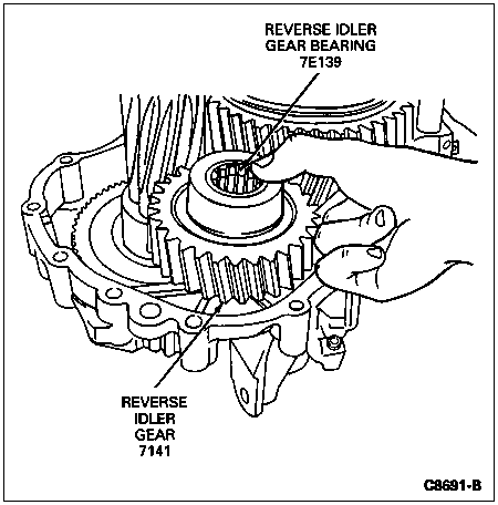 Lift the reverse idler gear shaft (7140) out of the reverse idler gear, and remove the reverse idler gear and two reverse idler gear bearings from the case.