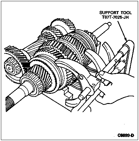 Turn the shift rails approximately 45 degrees to release them from the shift hubs. Lift the shift rails, 3-4 shifter forks and gear selector interlock sleeve, together with Shift Rod Support T87T-7025-JH, off the mainshaft.