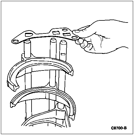 Using the shift rod support tool as a base, set the shift rail assembly on a workbench with the shift rails in a vertical position. Remove the gear selector interlock plate.