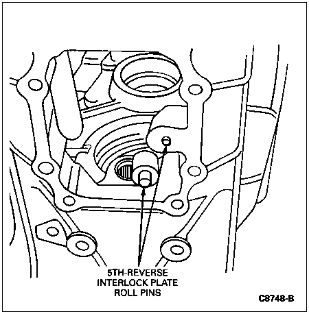 If required, remove the slotted spring pins that hold the 5th-reverse interlock plate from their bores in the case just below the shift control housing (7203).