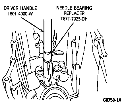 Heat the case in the area of the bearing bore of 5th-reverse shift rail to 160°C (320°F) with Rotunda Heat Gun 107-R0300 or equivalent. Drive the bearing sleeve in with Needle Bearing Replacer T87T-7025-DH and Driver Handle T80T-4000-W until it is flush with the surface of the bore.