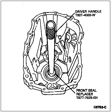 Position the oil seal in the case. Using Driver Handle T80T-4000-W and Front Seal Replacer T87T-7025-EH, drive in the oil seal until it seats against its stop.