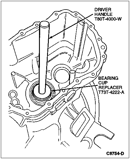 Position the output bearing front shim with proper thickness in the bore. Using Driver Handle T80T-4000-W and Bearing Cup Replacer T73T-4222-A, drive the output shaft bearing in until it seats against the stop in the case.