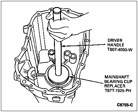 Position the correct input bearing front shim in the bore for the bearing. Using Driver Handle T80T-4000-W and Mainshaft Front Bearing Cup Replacer T87T-7025-PH, drive the bearing in until it seats against its stop in the bore.