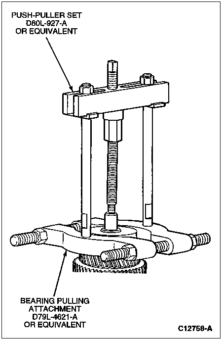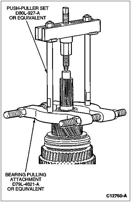 Position Push-Puller Set D80L-927-A or equivalent on the bearing gripper and pull the output shaft rear bearing from the mainshaft.