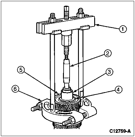 Position a bearing gripper such as Bearing Pulling Attachment D79L-4621-A or equivalent on the output shaft rear bearing. The gripper used must pull the output shaft rear bearing by the shoulder of the tapered rollers, not from the bearing cage.