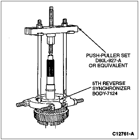 Position Push-Puller Set D80L-927-A or equivalent on the Bearing Pulling Attachment D79L-4621-A or equivalent and pull the 5th-reverse synchronizer body from the mainshaft.