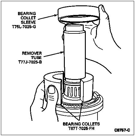 Place the Bearing Collets T87T-7025-FH or equivalent on either side of the input shaft pocket bearing. Position the Remover Tube T77J-7025-B in the collets. Pass the Bearing Collet Sleeve T75L-7025-G over the Remover Tube T77J-7025-B and into the collets so they clamp firmly to the input shaft pocket bearing. Pull the input shaft pocket bearing from the mainshaft.
