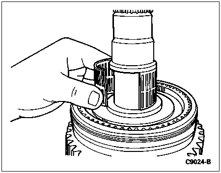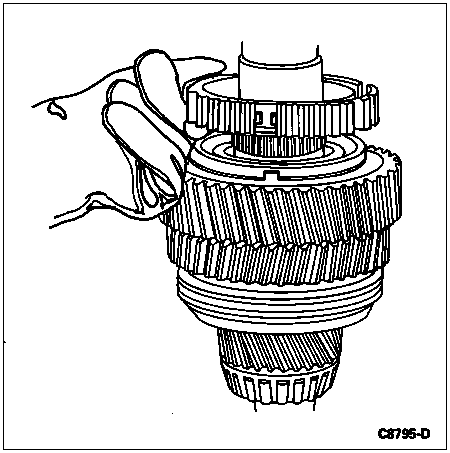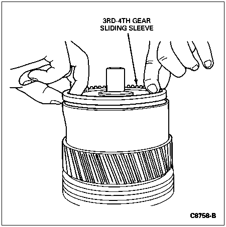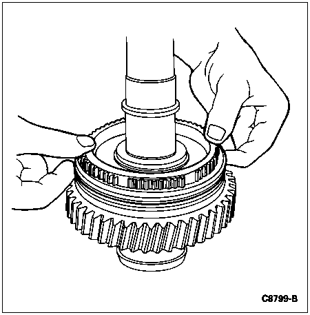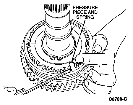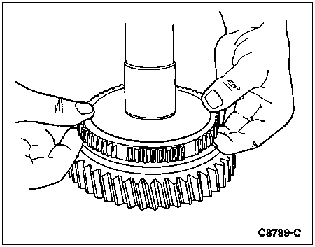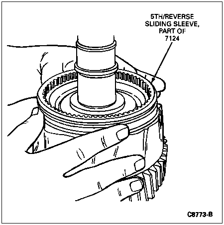 CAUTION: Position a cloth around the 5th-reverse synchronizer to catch the springs and pressure pieces that will be released when the sliding sleeve clears the 5th-reverse synchronizer.