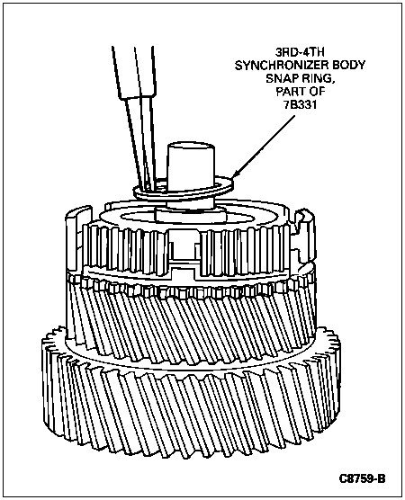 Install a new snap ring on the mainshaft next to the 3rd-4th synchronizer body (part of small parts repair kit). Clearance between the snap ring and the synchronizer body should not be more than 0.1mm (0.004 inch).