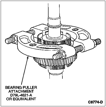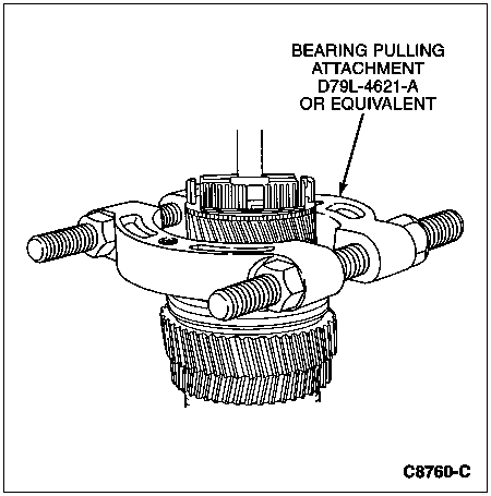 Place Bearing Pulling Attachment D79L-4621-A or equivalent over the mainshaft and let it rest on the mainshaft.