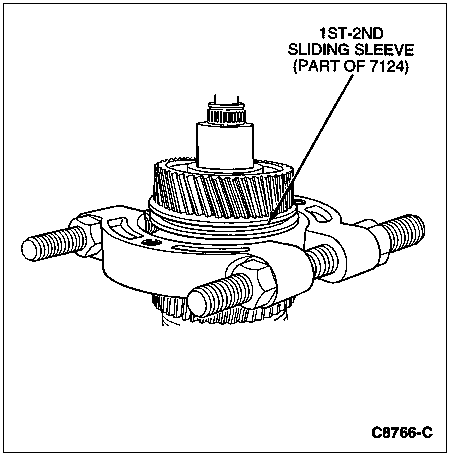 CAUTION: Position a cloth around the 1st-2nd synchronizer to catch the springs and pressure pieces that will be released when the sliding sleeve (part of synchronizer) clears the 1st-2nd synchronizer.