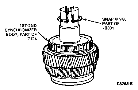 Remove the snap ring (part of small parts repair kit) retaining the 1st-2nd synchronizer body to the mainshaft.